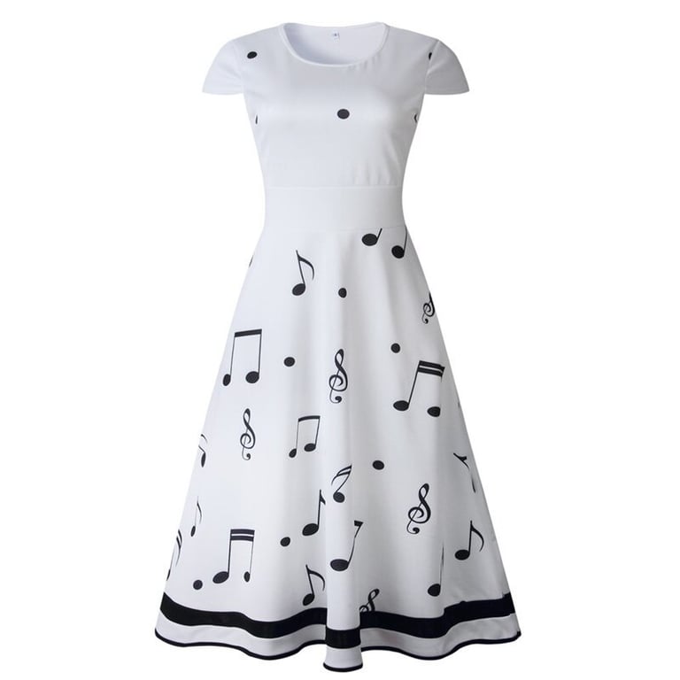Damenkleid mit weitem A-Linien-Rock. Tailliert in der Taille. Kurze Ärmel und runder Ausschnitt. Druck mit Notenmuster.