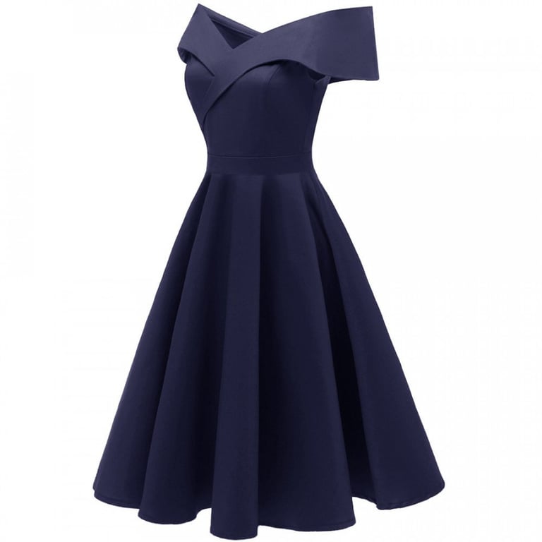 Damenabendkleid mit freiliegenden Schultern. Das Kleid hat einen weiten, schwingenden Rock und einen Reißverschluss auf der Rückseite. Erhältlich in zwei Farben – Blau und Rot.