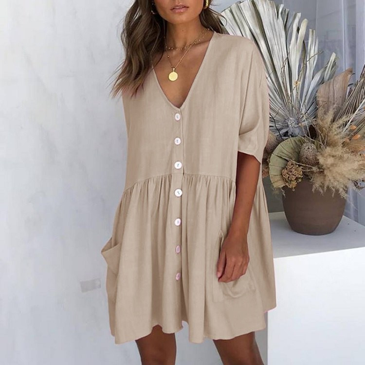 Damenkleid mit Knopfverschluss. Das Kleid hat kurze Ärmel und einen V-Ausschnitt. Lockere Passform mit Raffung und zwei seitlichen Taschen. In mehreren Farbvarianten erhältlich.