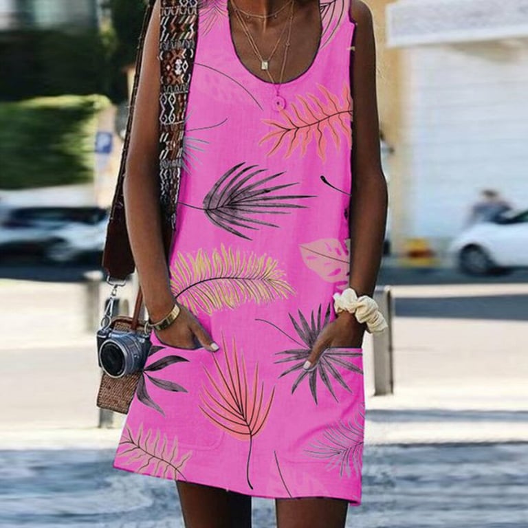 Damenkleid ohne Ärmel. Rundhalsausschnitt. Lockere kurze Passform mit Taschen. Bunter Druck. In mehreren Varianten erhältlich.