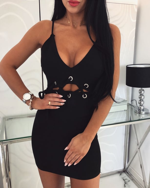 Sexy Damenkleid im figurbetonten Schnitt mit schmalen Trägern. Das Kleid wird hinten mit einem Reißverschluss geschlossen. Der vordere Teil ist in Oberteil und Rock mit hoher Taille unterteilt. Beide Teile sind durch Schnürung verbunden. Der Ausschnitt ist dreieckig. Erhältlich in zwei Farbvarianten – schwarz und rosa.