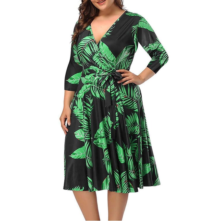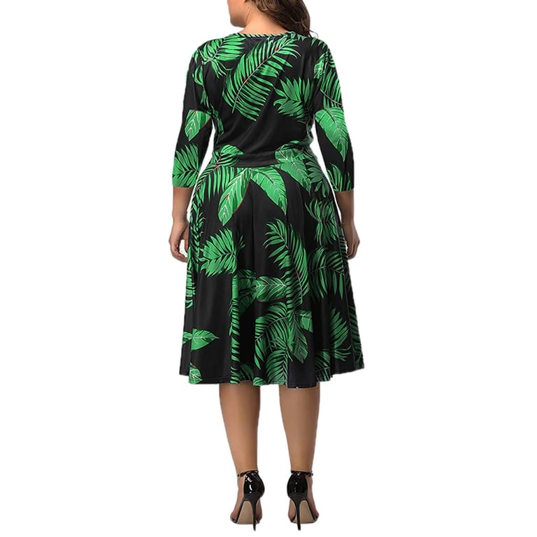 Schöne Sommerkleider, die bis zur Wade reichen. Ideal für den Sommer oder Frühling. Das Kleid hat einen Druck von tropischen Blättern. Im oberen Teil ist es gefaltet und hat einen V-Ausschnitt. Die Ärmel des Kleides sind kurz.