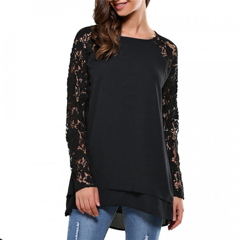 Damenoberteil mit langen Ärmeln, verziert mit Spitze und rundem Ausschnitt. Das Oberteil hat einen lockeren, asymmetrischen Schnitt. Erhältlich in mehreren Farbvarianten.