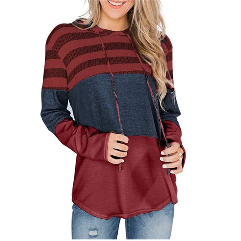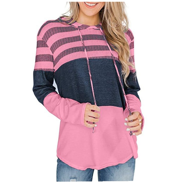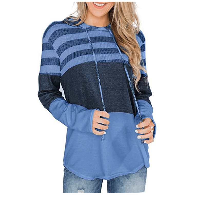 Damenpullover mit Kapuze und langen Ärmeln. Der Pullover hat einen lockeren Schnitt und ein gesticktes gestreiftes Muster.