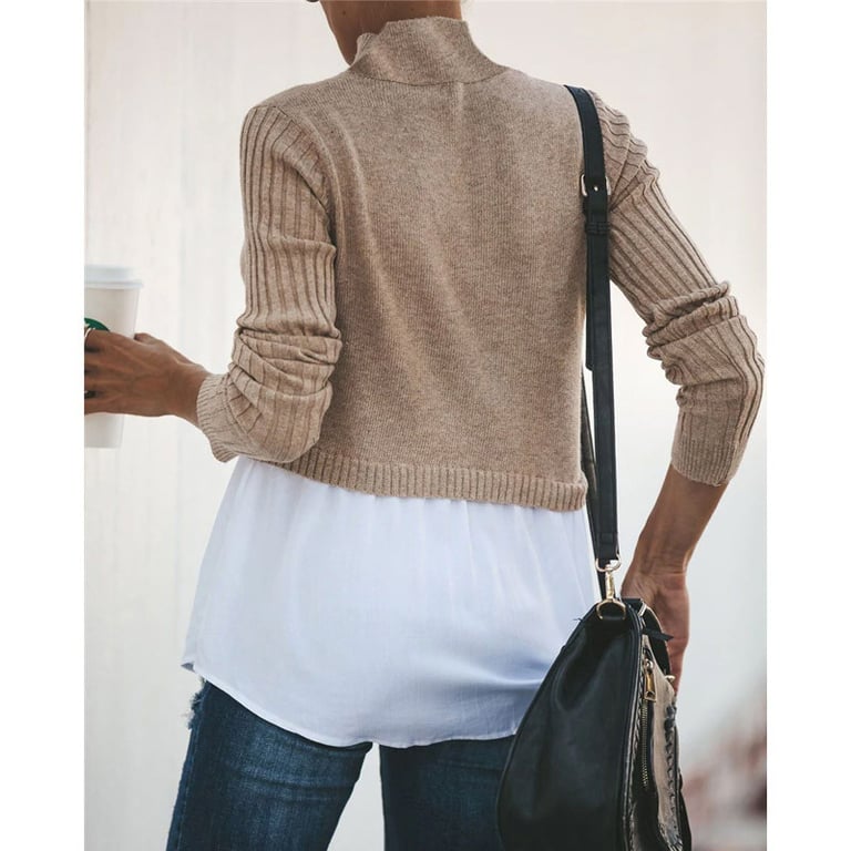 Damenpullover mit Rollkragen. Der Pullover hat ein eingenähtes Hemd im unteren Teil und lange Ärmel. Auswahl aus mehreren Farbvarianten.