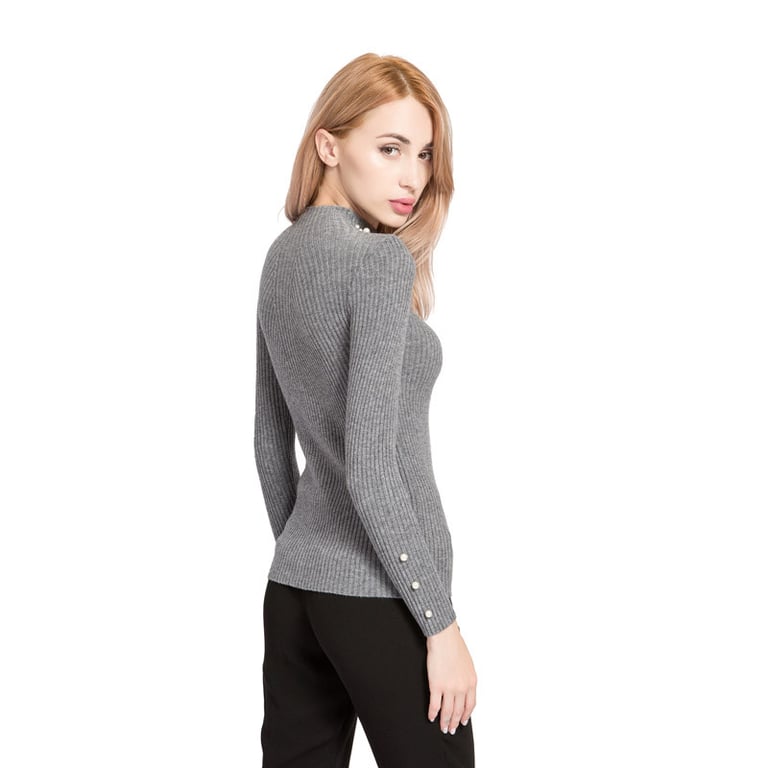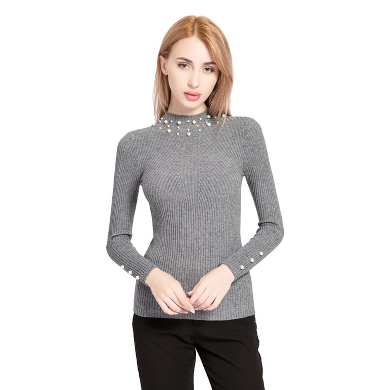 Damenpullover mit Rollkragen und langen Ärmeln. Universelle Größe. Der Pullover ist am Kragen und an den Ärmeln mit weißen Perlen verziert. Erhältlich in mehreren Farben.