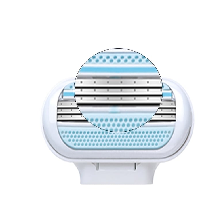 Revolutionäres Rasursystem mit drei Klingen, die speziell angeordnet sind, um sich schrittweise so nah wie möglich an Ihre Härchen heranzutasten und sie mit einem einzigen Zug so glatt und sanft wie möglich zu rasieren.