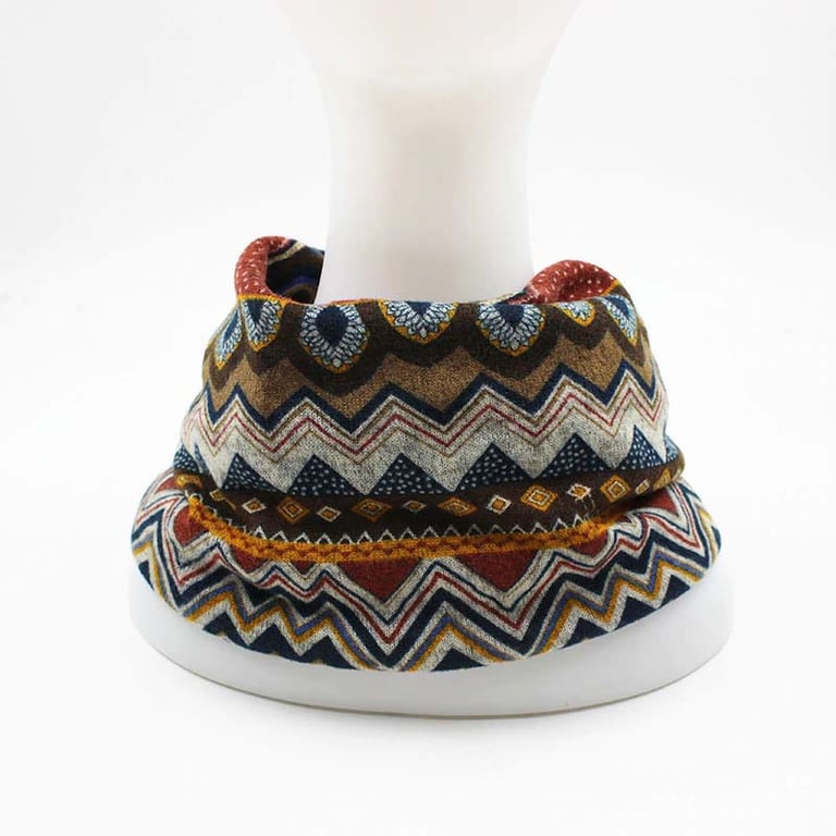 Stylische Damenmütze mit buntem Muster. Es handelt sich um eine variable Mütze, die Sie leicht in einen Schal verwandeln können.