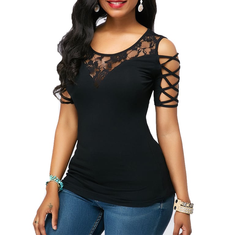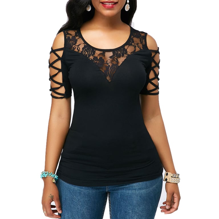 Damenbluse mit kurzen Ärmeln und rundem Ausschnitt mit Spitze.