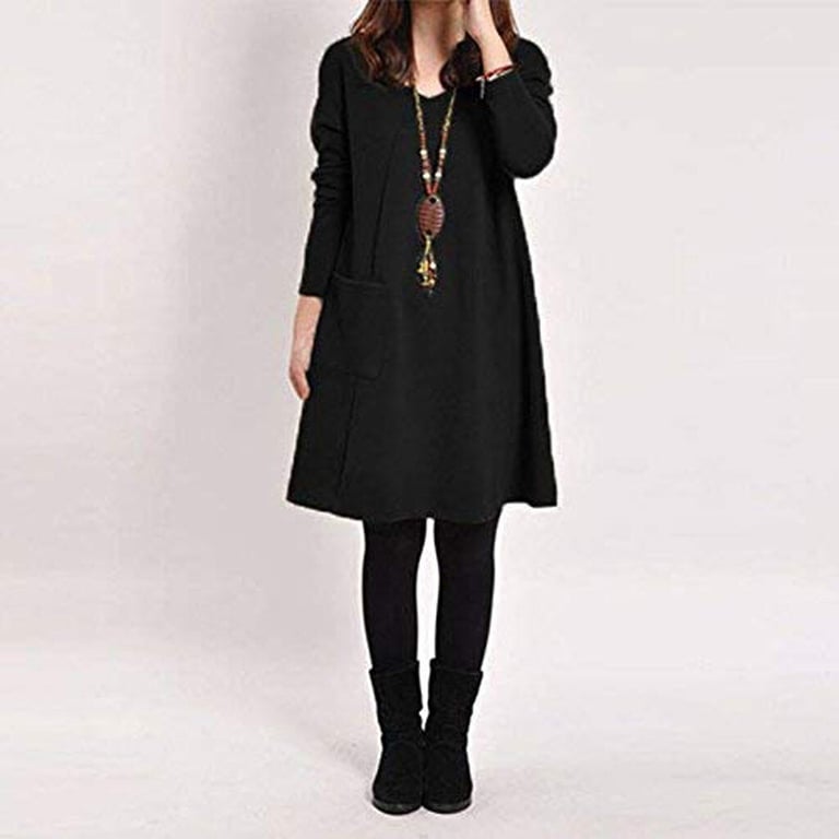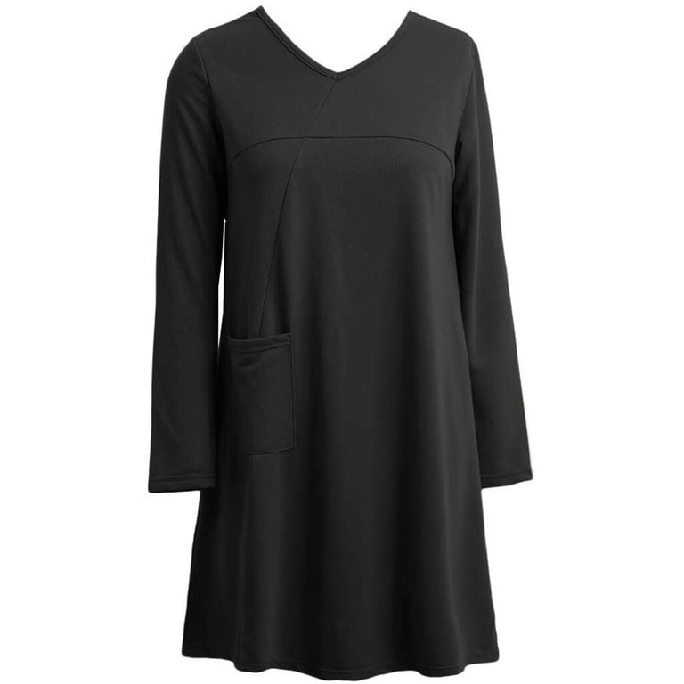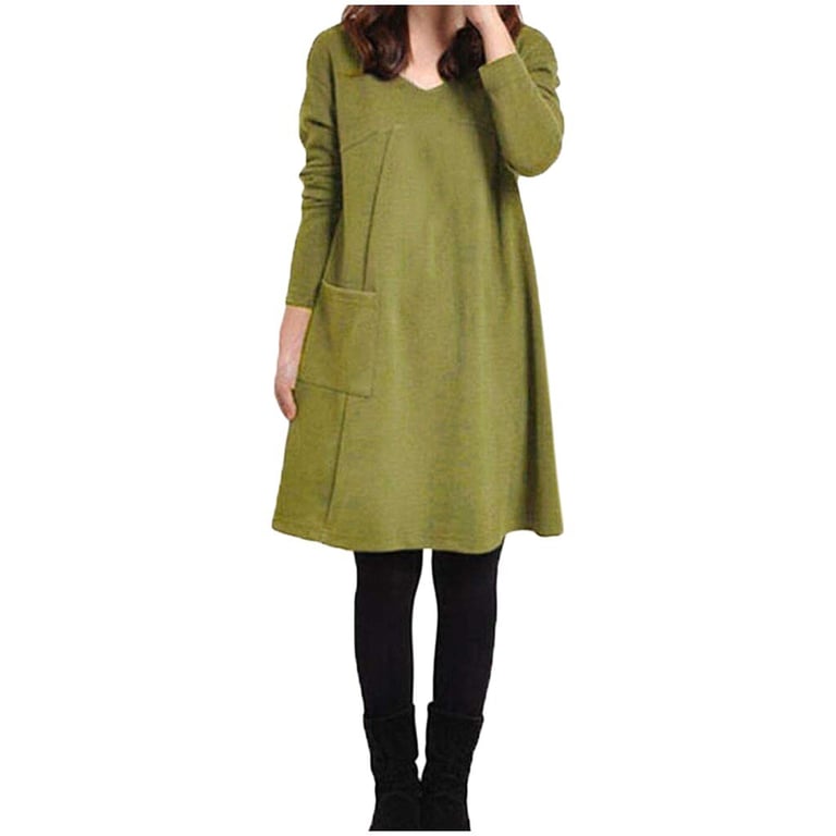 Damen lockeres Kleid, lange Ärmel, V-Ausschnitt, knielange, mit Tasche.