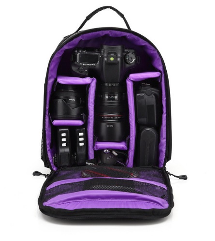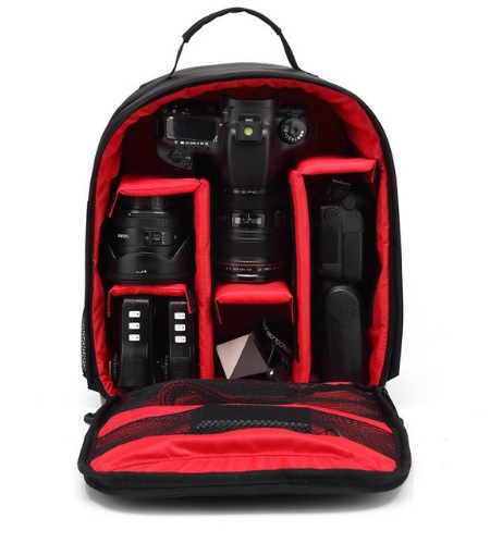 Stylischer Rucksack mit farbigem Innenfutter, kompatibel mit den meisten digitalen Spiegelreflexkameras.