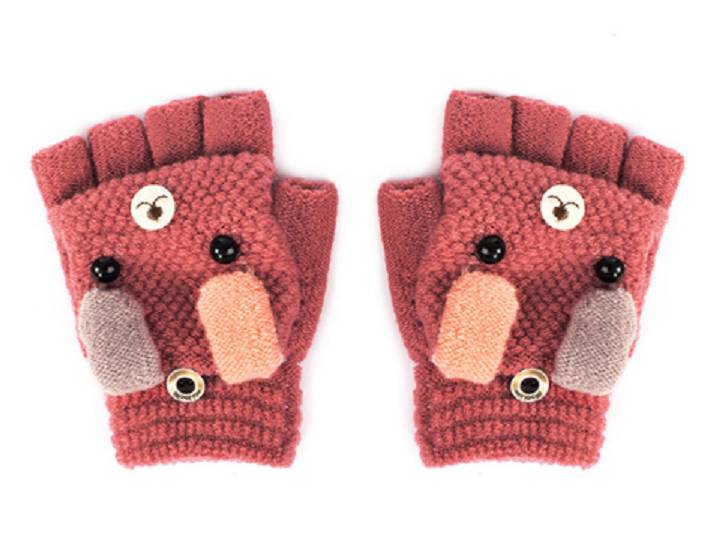 Diese schönen fingerlosen Handschuhe können zu Fäustlingen umgewandelt werden. Auf den Handschuhen ist ein Hund abgebildet.