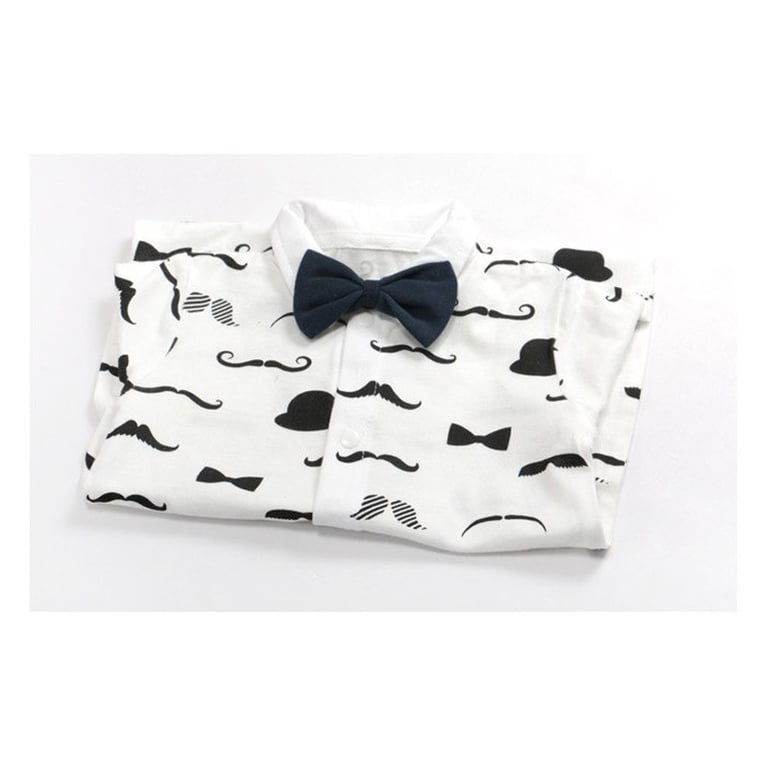 Origineller Kinder-Overall mit kurzen Ärmeln. Mit Knöpfen zu schließen. Weiß mit einem Motiv von schwarzen Schnurrbärten und einer Fliege.
