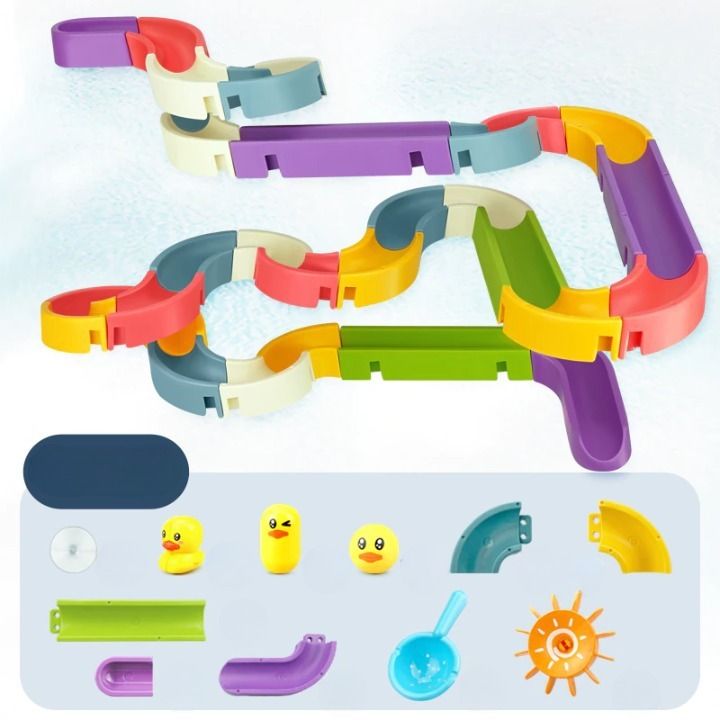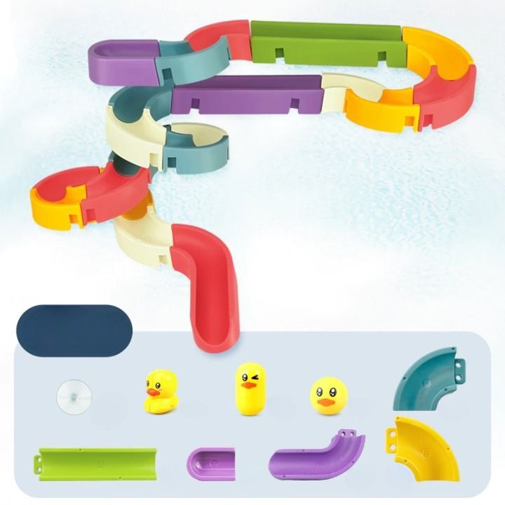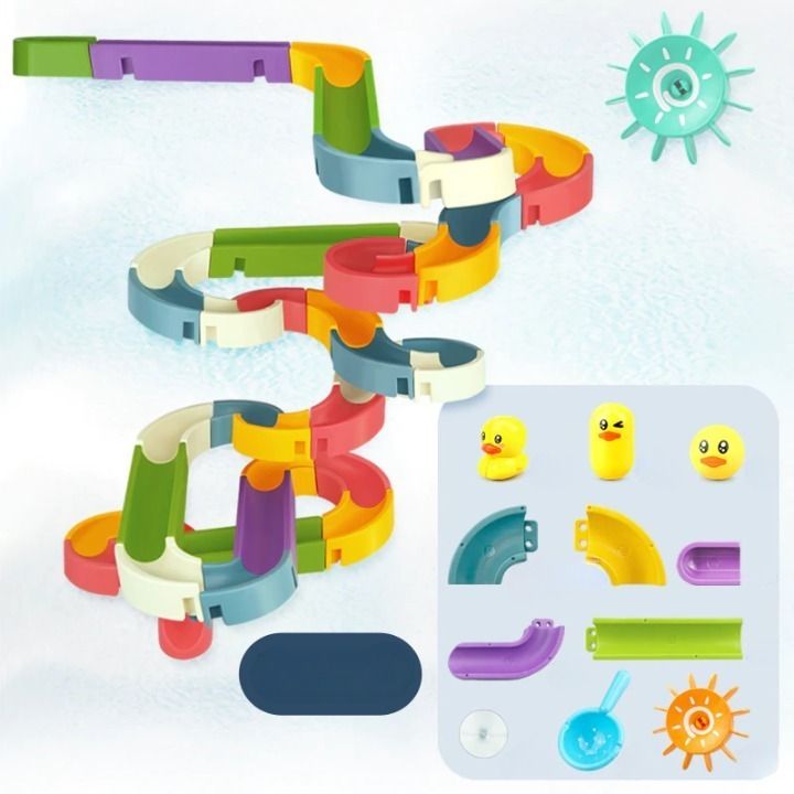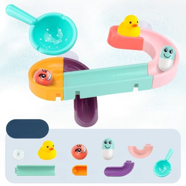 • Packung 48 Stück: 9 x Saugnapf, 2 x Ente, 2 x Kugel, 2 x Pille, 12 x kleine Kurve, 4 x gerade Bahn, 2 x Endstück, 1 x längliche Kurve, 12 x Kurve, 1 x Schöpflöffel, 1 x Karussell