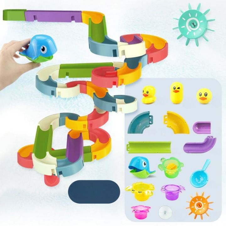 • Packung 39 Stück: 8 x Saugnapf, 2 x Ente, 2 x Kugel, 2 x Pille, 8 x kleine Kurve, 2 x gerade Bahn, 1 x Endstück, 1 x längliche Kurve, 8 x Kurve, + Wal und 4 Wasserbehälter