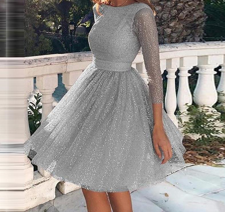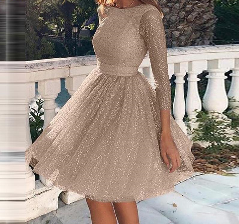 Kurzes, glitzerndes Abendkleid mit langen Ärmeln