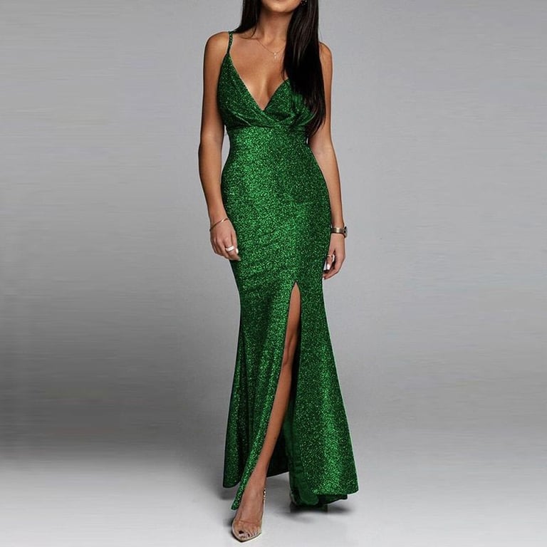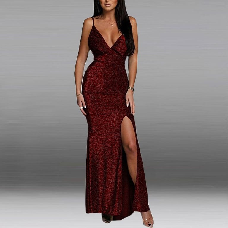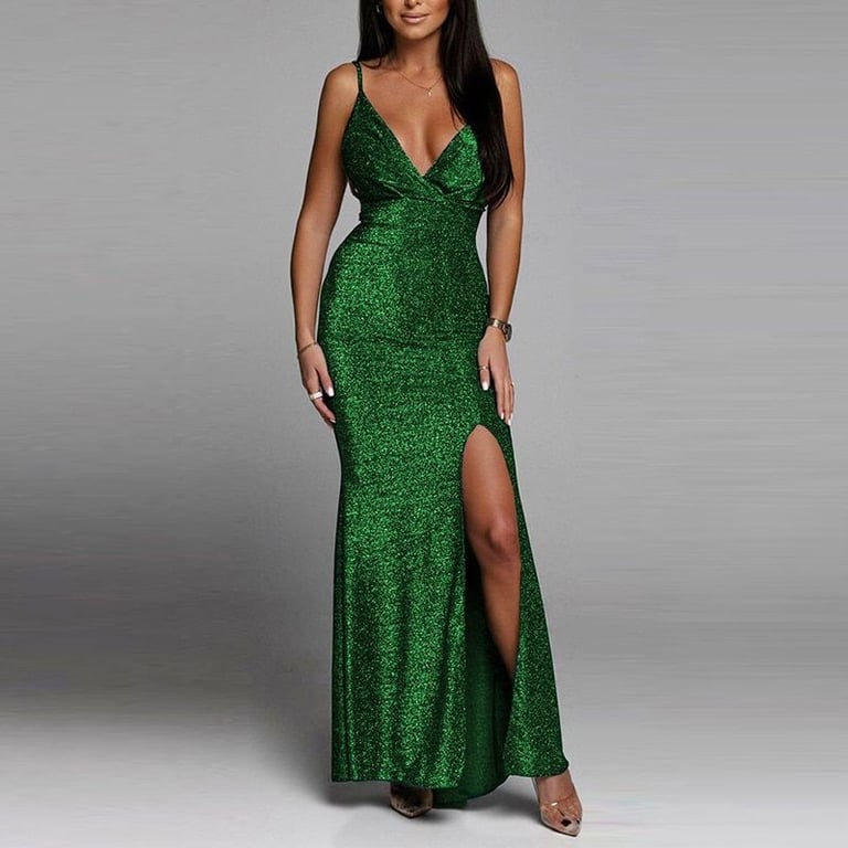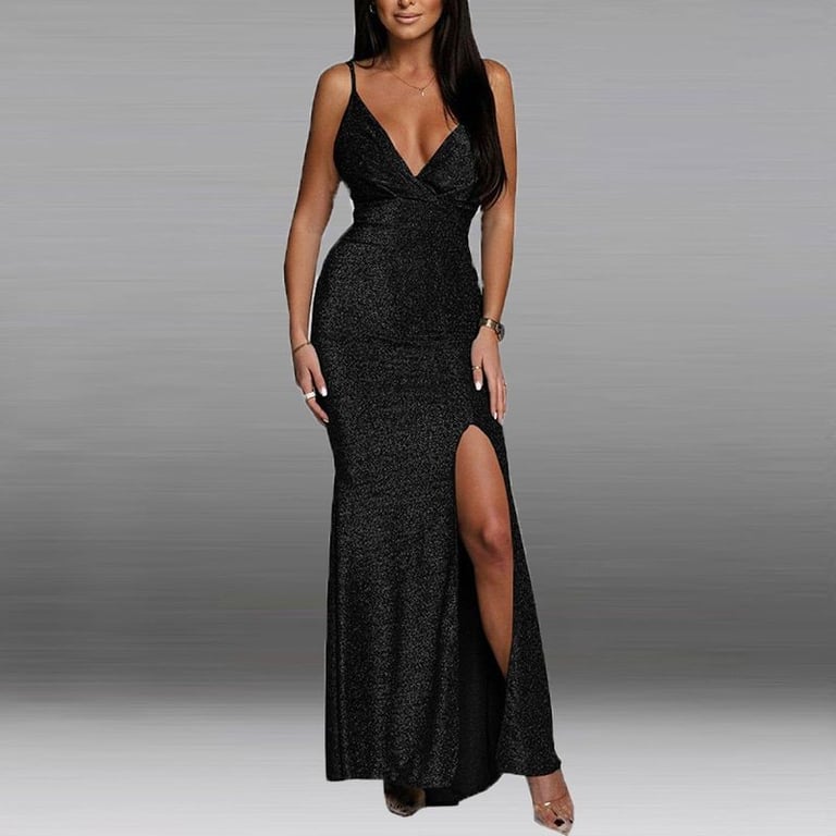 Luxuriöses langes Abendkleid mit Glitzer und tiefem Ausschnitt.