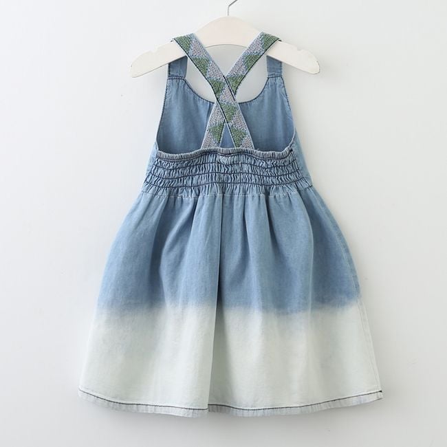 Kinderjeanskleid im Sommerdesign. In der Größentabelle sind die Maße des Produkts angegeben, nicht die des Körpers.