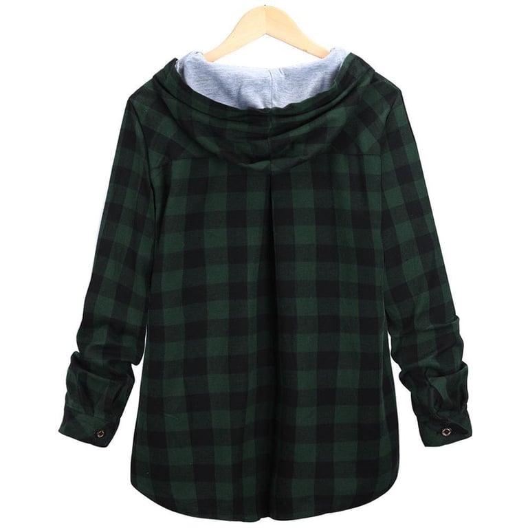 Damen Trendjacke im karierten Hemdenmuster. Die Jacke hat eine Kapuze mit Kordelzug und einen Knopfverschluss.