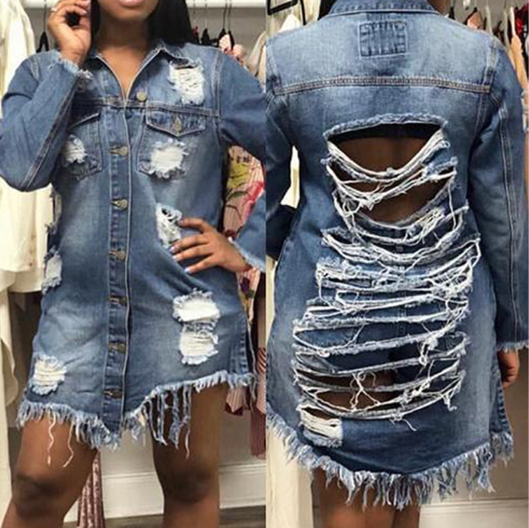 Modische lange zerrissene Damenjeanskleider mit Knöpfen