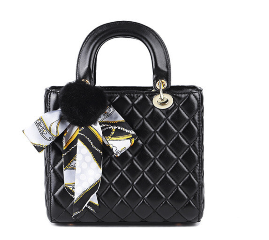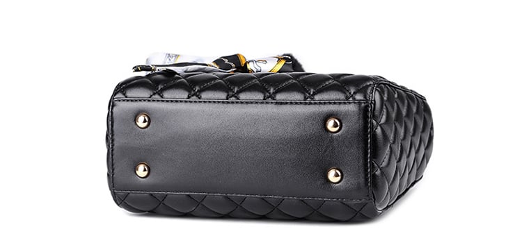 Die elegante Damenhandtasche Stefania ist schon auf den ersten Blick beeindruckend. Diese Tasche hat einen verstärkten Boden, der außen mit metallischen Nieten versehen ist. Teil der Tasche ist ein kürzerer Griff, der sich zum Tragen am Unterarm oder in der Hand eignet, sowie ein verstellbarer Schultergurt. Ein dekoratives Tuch, das zu einer Schleife gebunden ist, unterstreicht das insgesamt luxuriöse Erscheinungsbild der Tasche. Alle metallischen Teile der Tasche sind goldfarben.