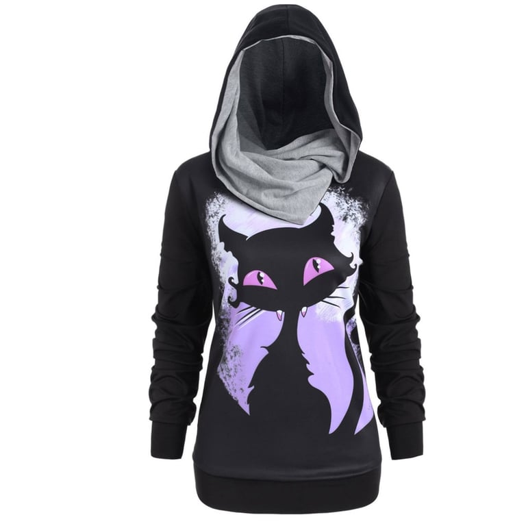 Charmanter Pullover mit Katzenmuster und großer praktischer Kapuze.