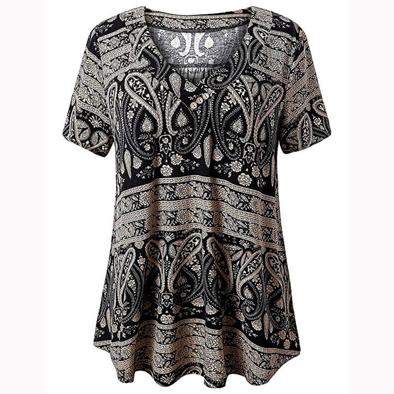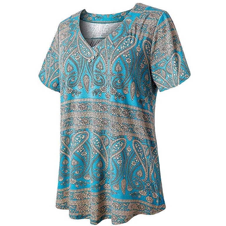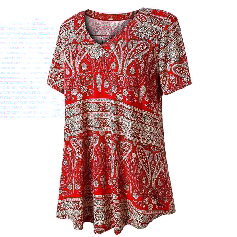 Lockeres Damen T-Shirt mit kurzen Ärmeln, V-Ausschnitt mit Knöpfen, erhältlich in drei Farben.