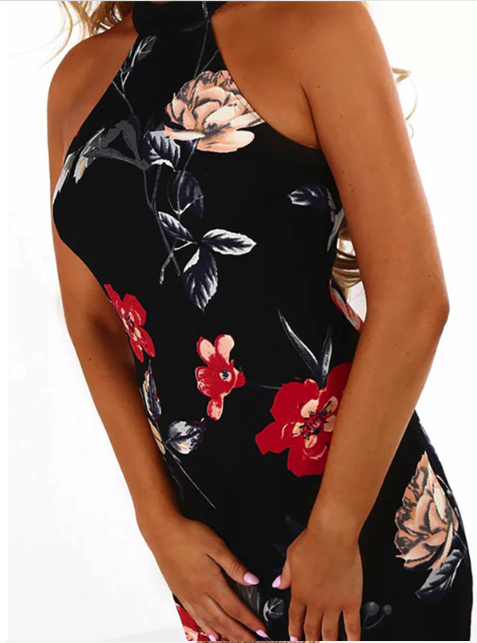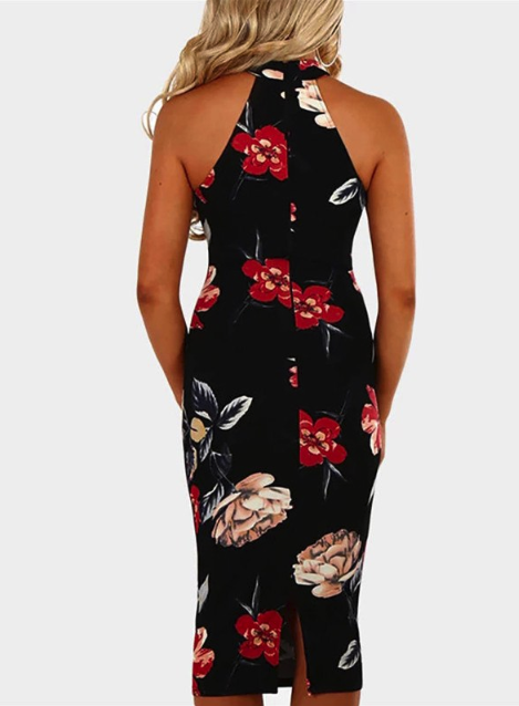Schwarzes Blumenmuster Slim-Fit Damenkleid mit Kragen