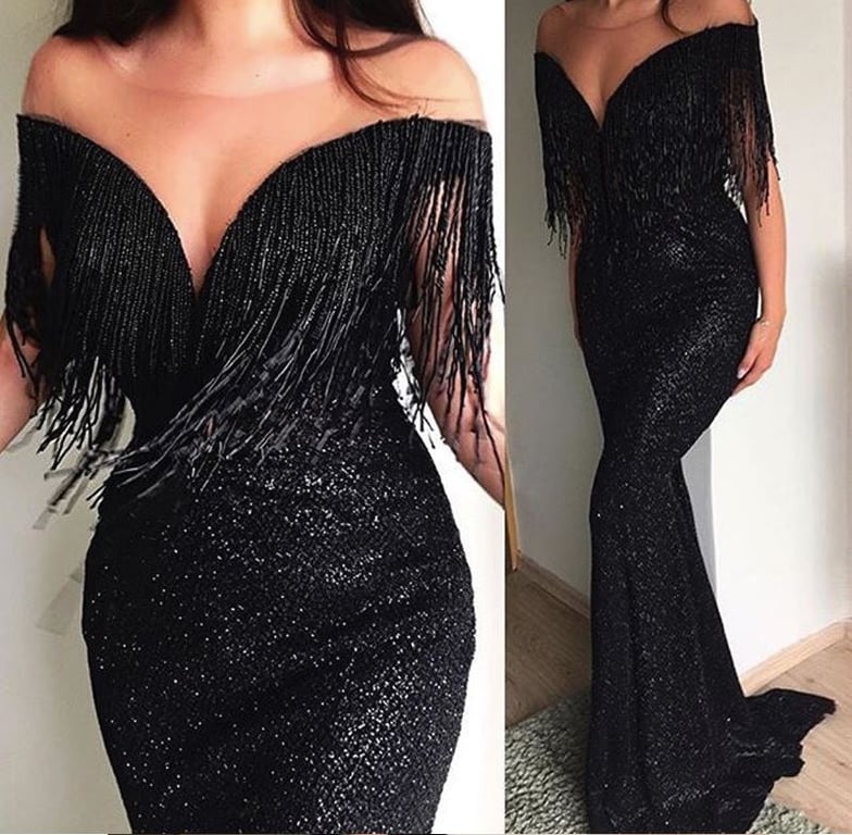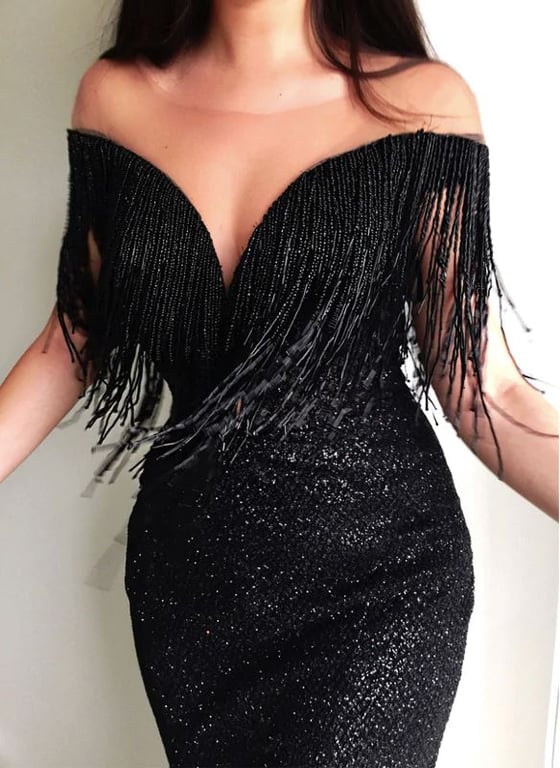 Schwarzes enges formendes Abendkleid mit Fransen