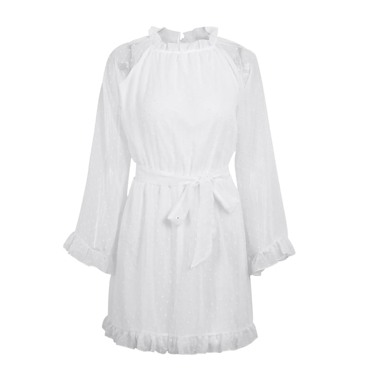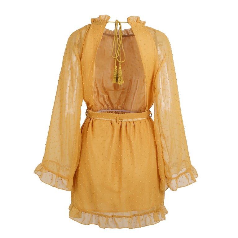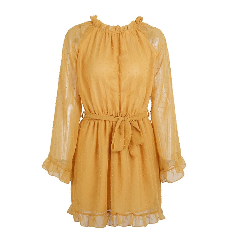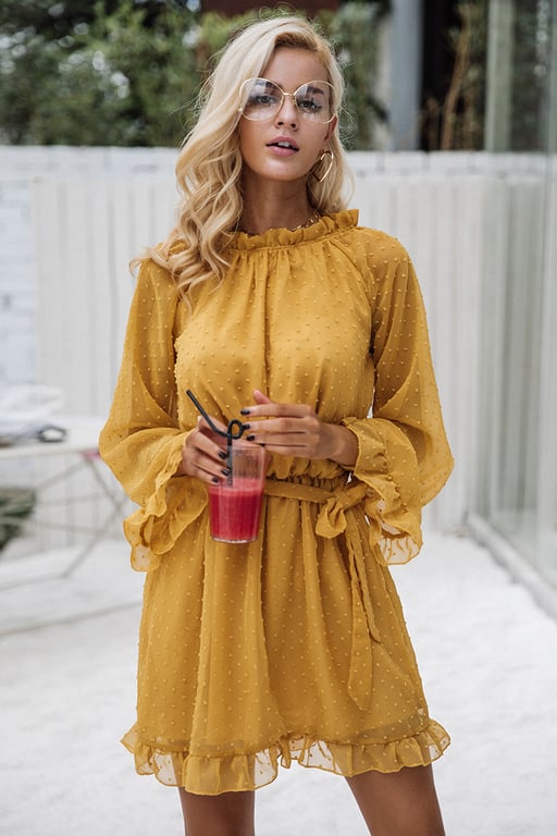Senfgelbe kurze schöne Damenkleider mit Rüschen