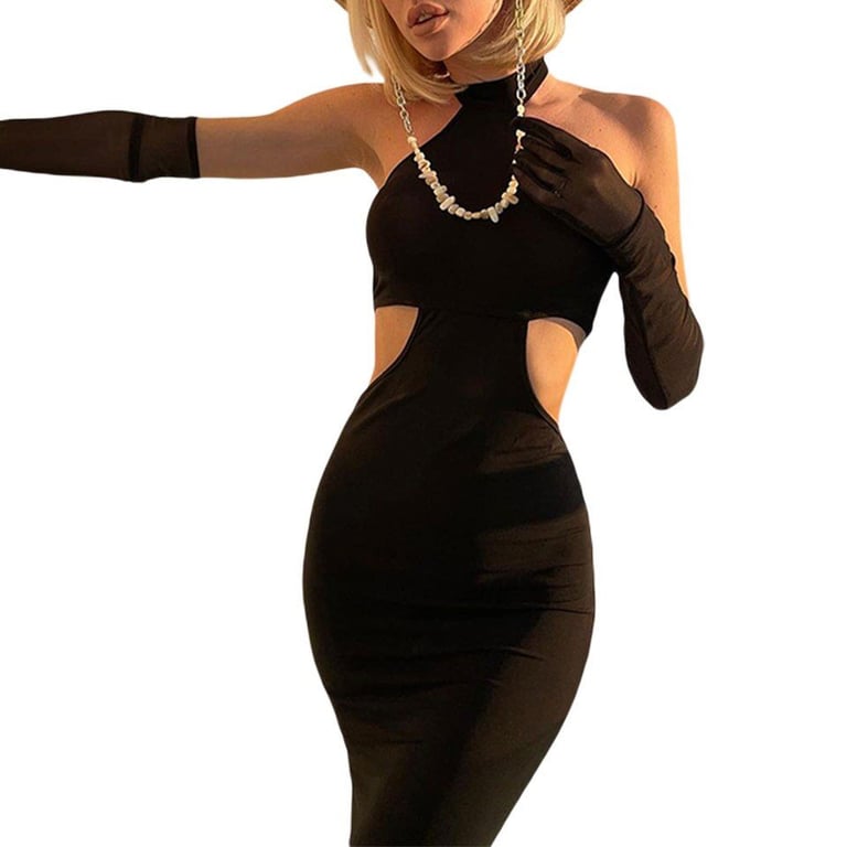 Ein einfaches schwarzes, aber dennoch durch die seitlichen Ausschnitte interessantes Abendkleid.