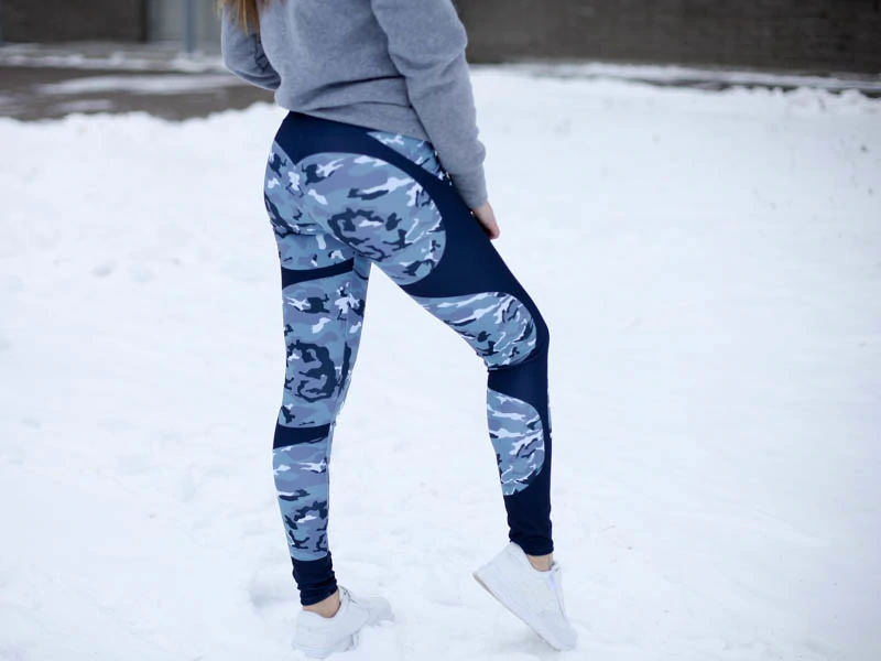 Damenstylische Push-Up Leggings mit Camouflage-Muster oder einfarbig. Die Leggings haben schwarze Einsätze über die gesamte Länge, was einen designtechnischen Eindruck vermittelt. Sie formen die Figur schön.