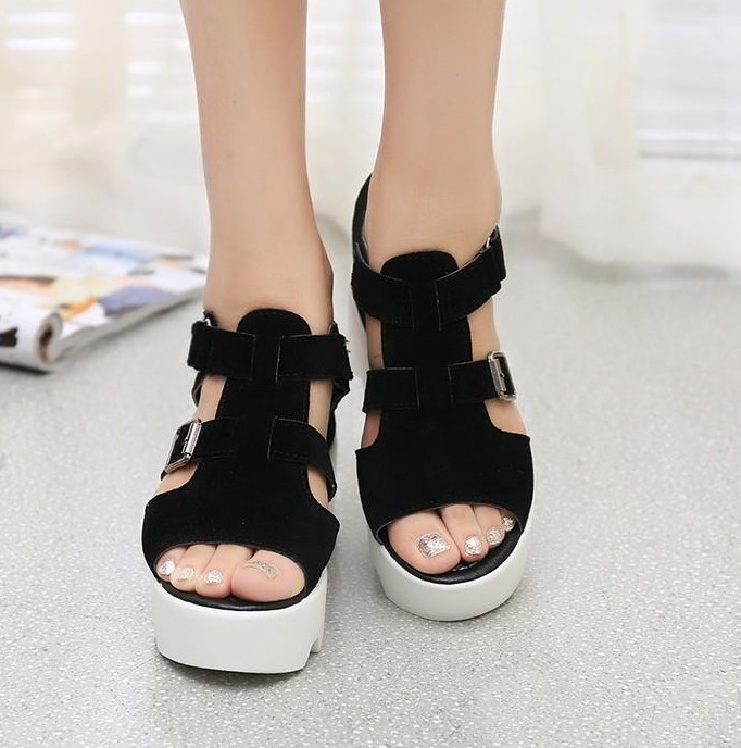 Modische Plateausandalen. Schwarze Gladiatorensandalen.