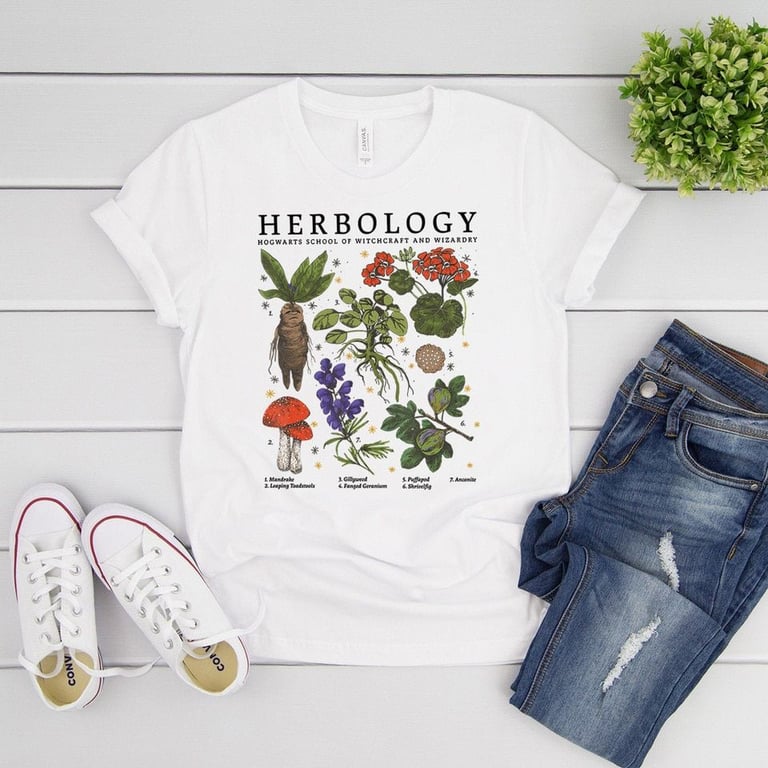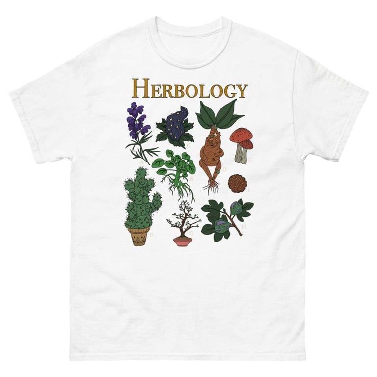 Unisex minimalistisches T-Shirt mit kurzen Ärmeln und originellem Druck Herbologie.