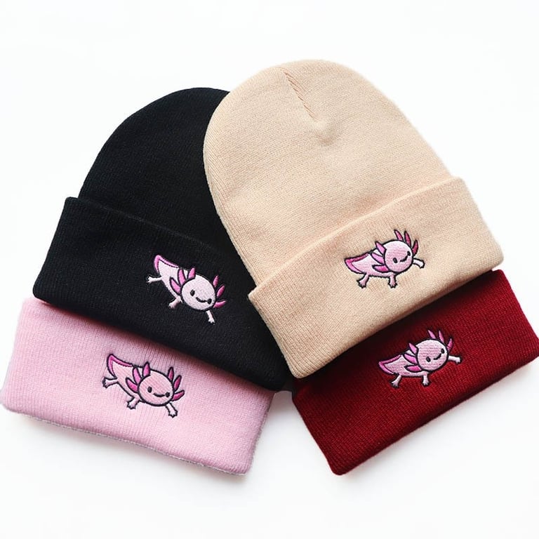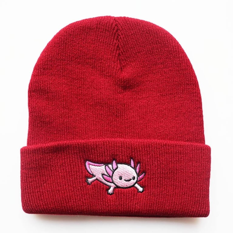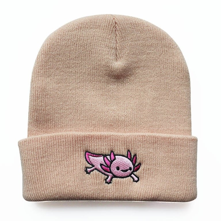 Unisex Strickmütze mit süßem Aufnäher des Wasserdrache Axolotl