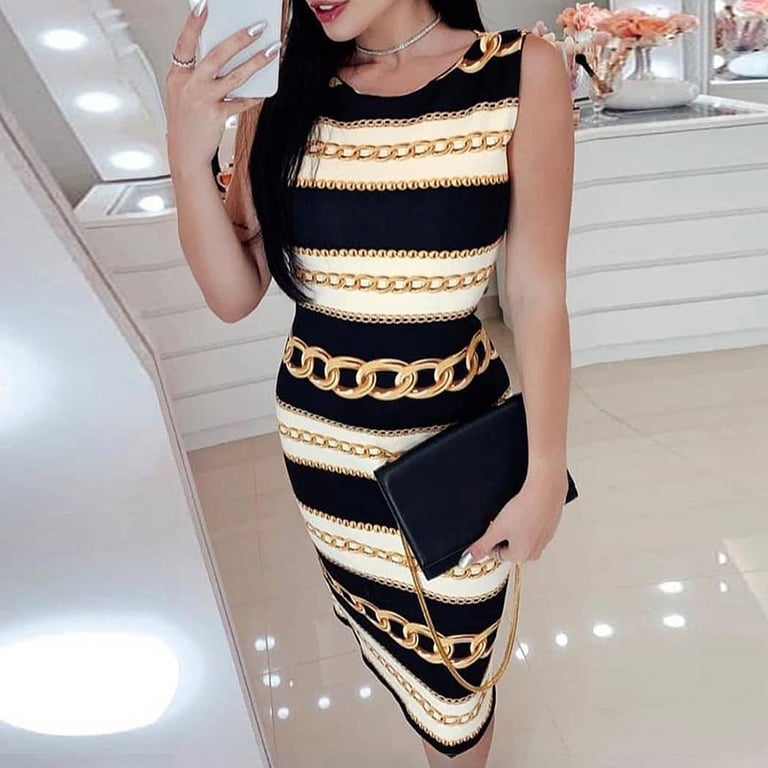 Damenabendkleid mit buntem Muster. Das Kleid hat einen figurbetonten, ärmellosen Schnitt. Länge bis zum Knie.