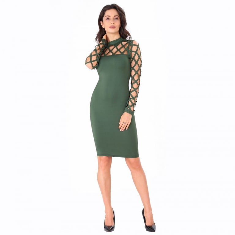 Damenabendkleid mit Rollkragen. Das Kleid ist leicht tailliert und hat eine knielange Länge. Die Ärmel und der Ausschnitt sind mit einem interessanten Netzdesign gestaltet. Erhältlich in mehreren Farben.