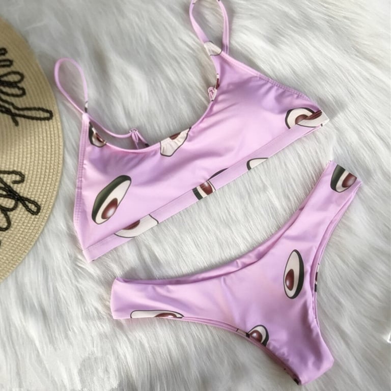 Damen Zweiteiler Badeanzug in Rosa. Druck mit Avocado-Motiv. Oberteil mit schmalen Trägern und Schnallenverschluss.