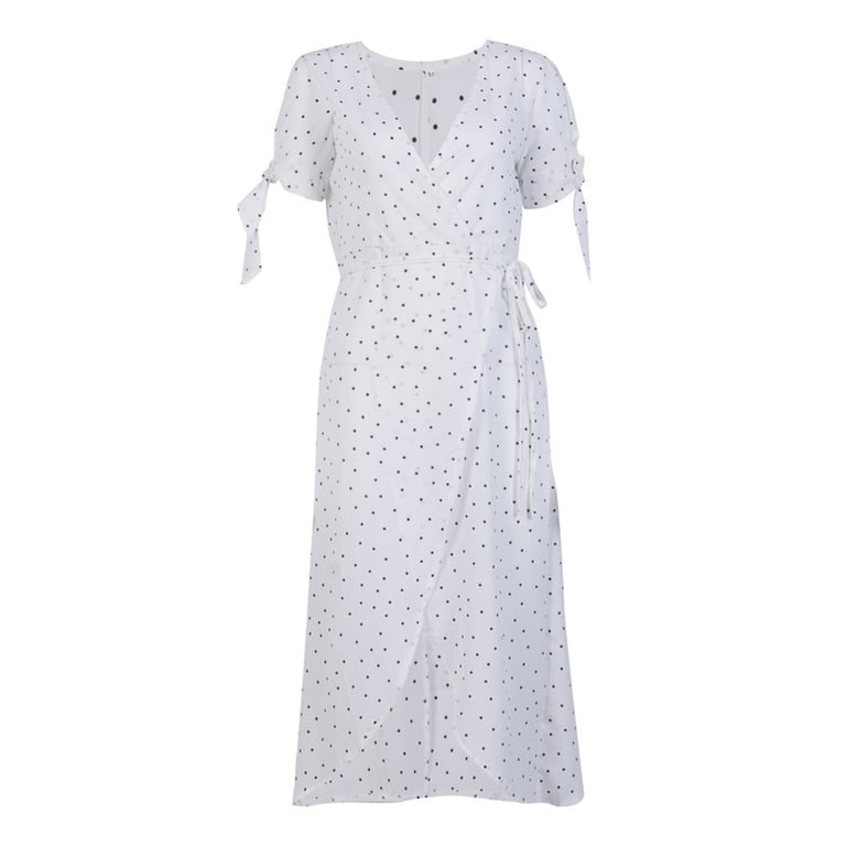 Damenlange Kleider mit tiefem V-Ausschnitt und kurzen Ärmeln mit Schleife. Das Kleid ist wickelbar und hat eine Schleifenbindung, der Rock hat einen hohen Schlitz an der Seite. Weiß mit gepunktetem Muster.