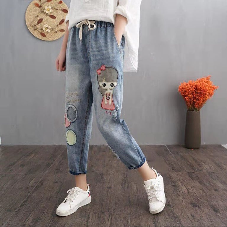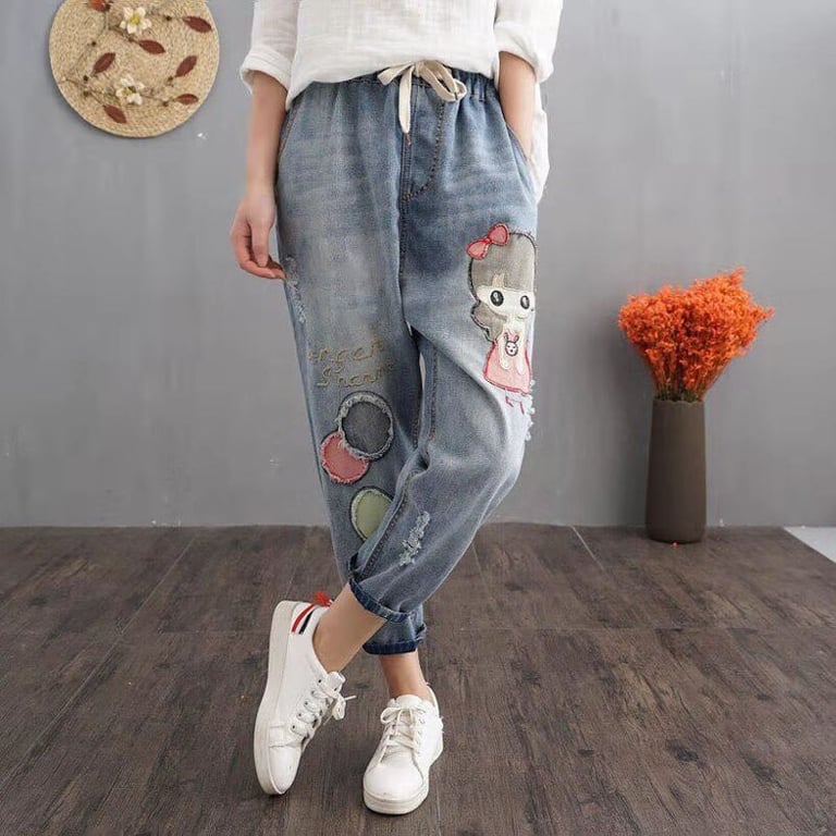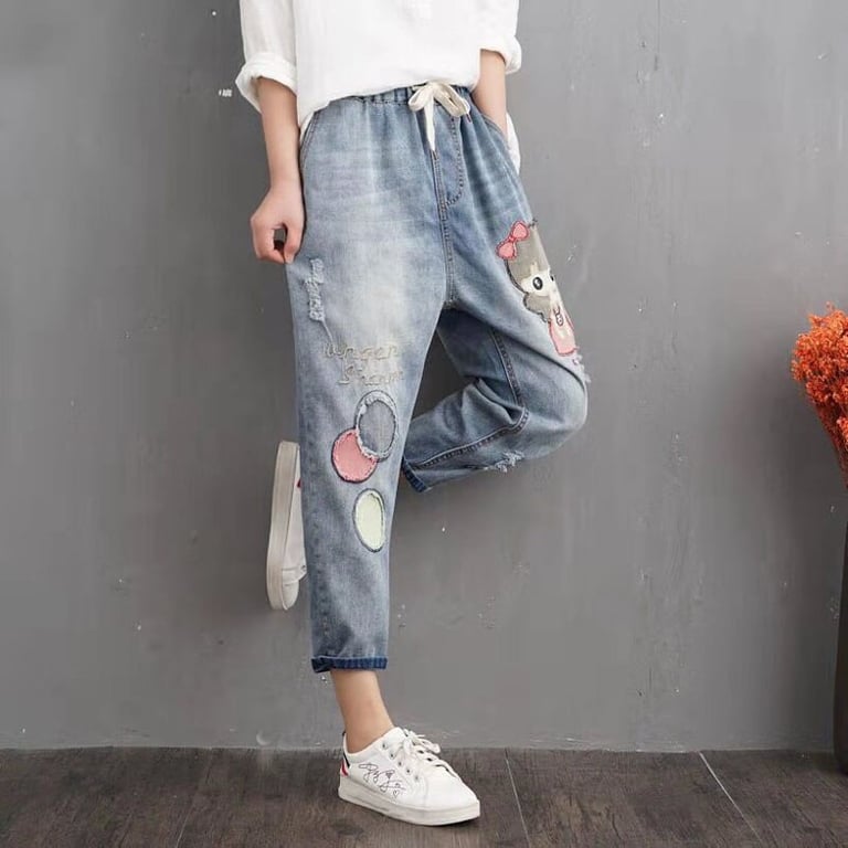 Damen Boyfriend-Jeans mit elastischem Gummibund. Weite Hosenbeine. Abgenutzter Look. Mit Applikationen verziert.