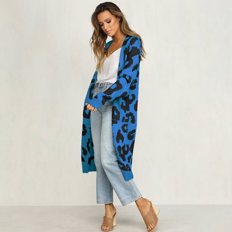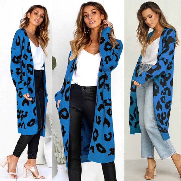 Damen langer Cardigan ohne Verschluss. Der Cardigan hat einen lockeren Schnitt mit weiten Ärmeln, zwei seitlichen Taschen und einem Tiermuster. Erhältlich in mehreren Farbvarianten.