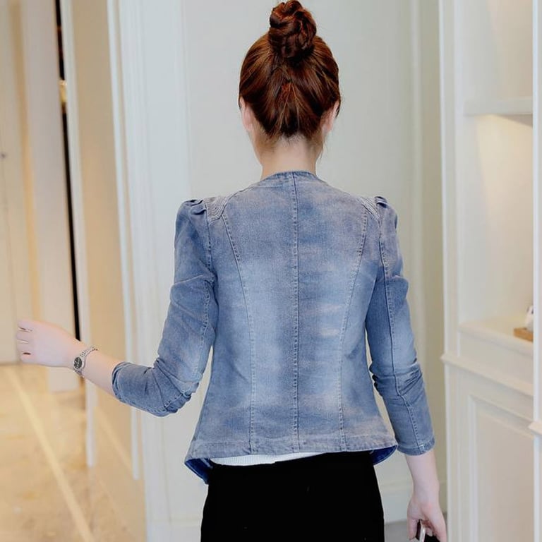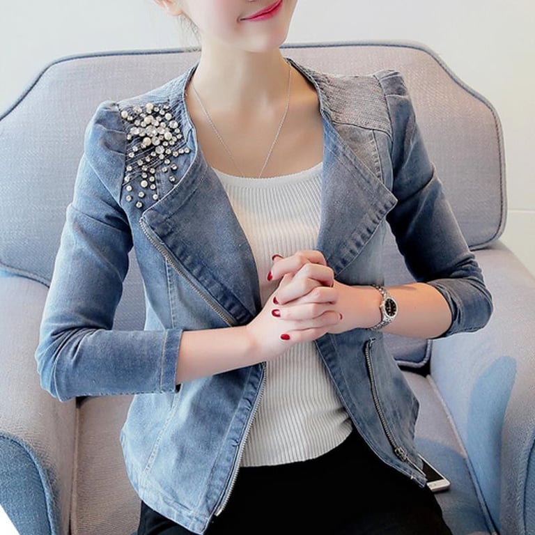 Damenjeansjacke mit Reverskragen und schrägem Reißverschluss. Figurbetonter Schnitt. Schulter mit aufgenähten Steinen verziert.