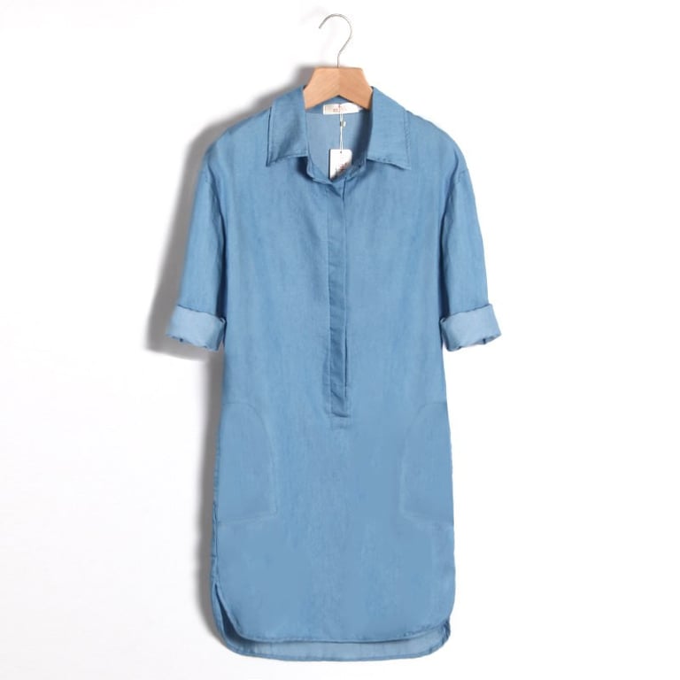 Damenjeanskleider mit Dreiviertelärmeln und V-Ausschnitt mit Kragen. Das Kleid hat einen lockeren, geraden Schnitt und zwei seitliche Taschen. Erhältlich in zwei Varianten.