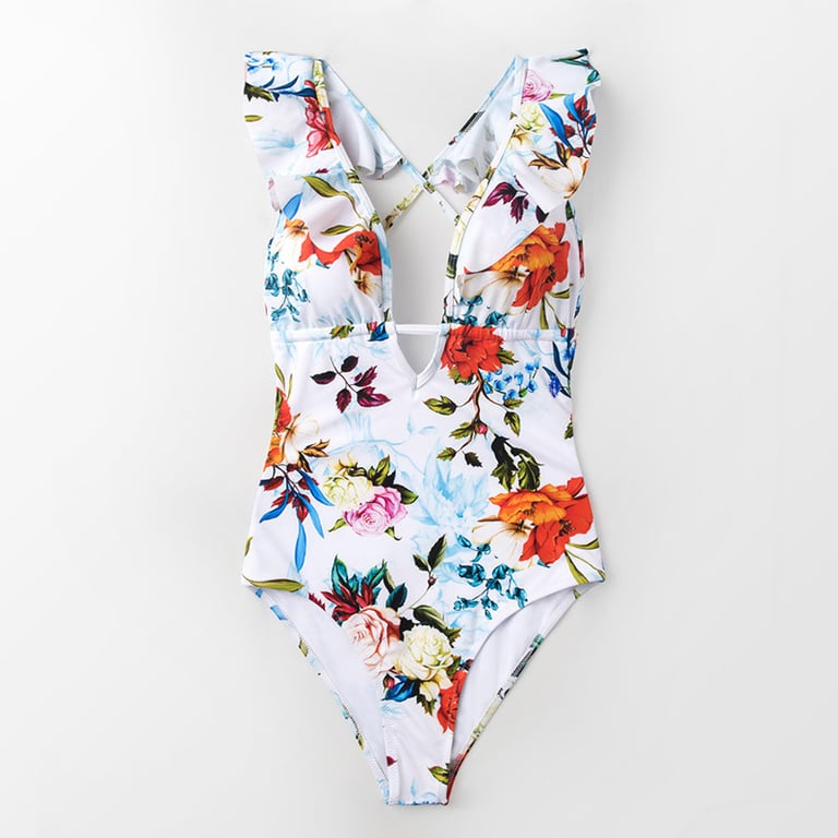 Damen Einteiler mit schmalen, über Kreuz verlaufenden Trägern auf dem Rücken. Tiefer V-Ausschnitt mit Rüsche verziert. In mehreren Farbvarianten erhältlich.