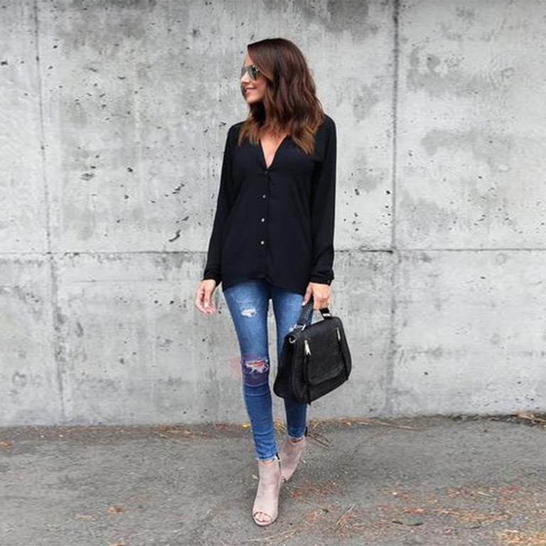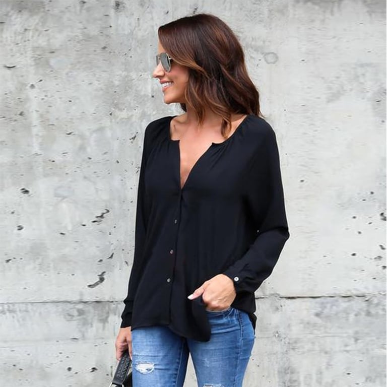 Damenbluse in elegantem, schlichtem Design. Die Bluse hat lange Ärmel und einen V-Ausschnitt mit Knopfverschluss. Glattes, angenehmes Material. Erhältlich in zwei Varianten.