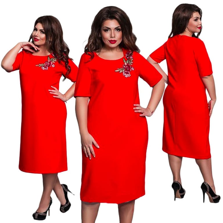 Damenkleid in geradem Schnitt in eleganter einfarbiger Ausführung. Das Kleid hat kurze Ärmel, einen runden Ausschnitt und auf der Vorderseite ein aufgenähtes Blumenmotiv. Erhältlich in mehreren Varianten und in Plus-Size-Größen.