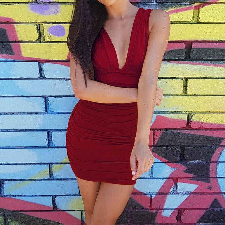 Kleid mit sexy V-Ausschnitt. Mit diesem Stück werden Sie bei jeder gesellschaftlichen Veranstaltung alle begeistern.
