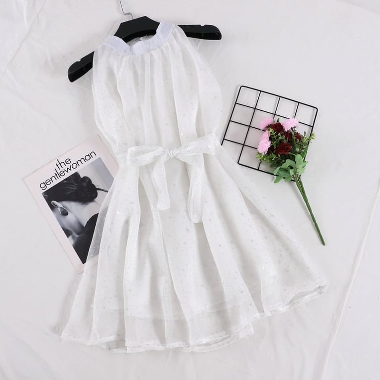 Damenkurzes Kleid mit glitzernder Oberfläche. Das Kleid ist ärmellos mit Trägern und hat einen lockeren, gerafften Rock sowie ein Band zum Binden in der Taille. Erhältlich in mehreren Farben.