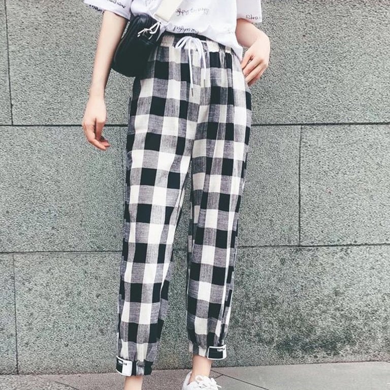 Damen-Harem-Hosen mit niedrigem Bund und elastischem Gummibund. Schmal zulaufende Hosenbeine. Schwarz-weißer Karomuster.