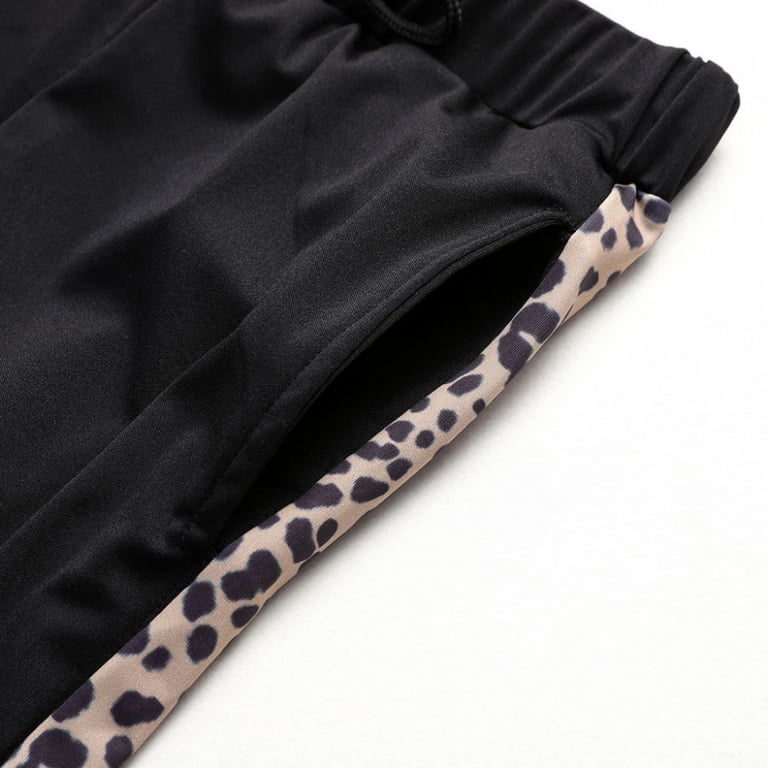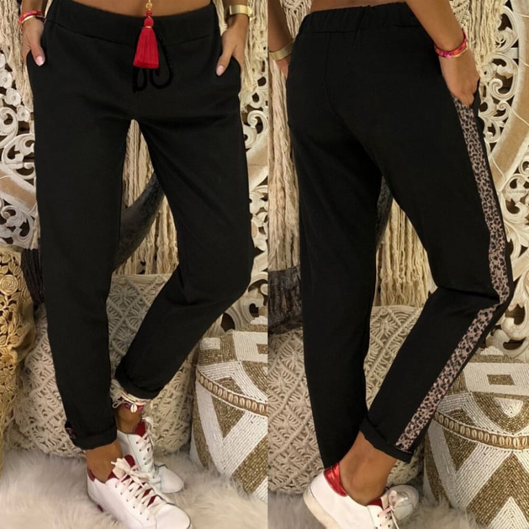 Damen Jogginghose mit elastischem Gummibund. Dekorativer seitlicher Streifen mit Leopardenmuster. Seitentaschen.
